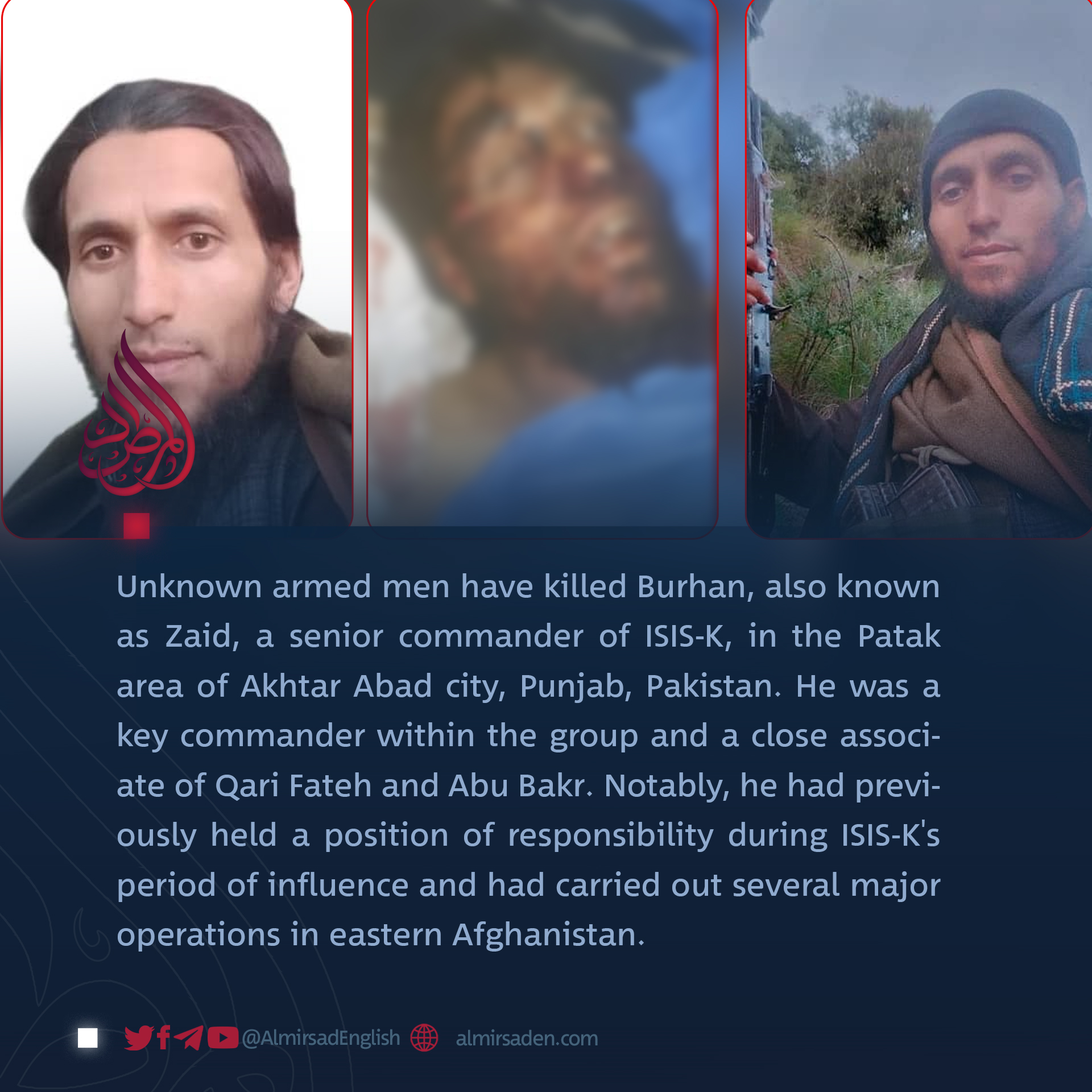 Unknown armed men have killed Burhan, also known as Zaid, a senior commander of ISIS-K, in the Patak area of Akhtar Abad city, Punjab, Pakistan. He was a key commander within the group and a close associate of Qari Fateh and Abu Bakr. Notably, he had previously held a position of responsibility during ISIS-K’s period of influence and had carried out several major operations in eastern Afghanistan.